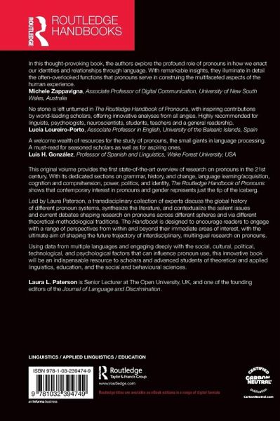 Led by Laura Paterson, a transdisciplinary collection of experts discuss the global history of different pronoun systems, synthesize the literature, and contextualize the salient issues and current debates shaping research on pronouns across different spheres and via different theoretical-methodological traditions. The Handbook is designed to encourage readers to engage with a range of perspectives from within and beyond their immediate areas of interest, with the ultimate aim of shaping the future trajectory of interdisciplinary, multiingual research on pronouns.