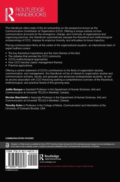 Foreword: The Emerging Paradigm of Communication Constitutes Organization (CCO); Introduction; Part I: Theoretical Discussions; 1. The Theoretical Roots of CCO; 2. What's Pragmatic about Ambiguity in the Communicative Constitution of Organizations? The Case of CCO Scholarship's Establishment; 3. Organization as Conversation and Text; 4. Theorizing Communication and Constitution of Organizations from a Four Flows (Structurational) Perspective; 5. The Communicative Constitution of the World: A Luhmannian View on Communication, Organizations, and Society; 6. The Multiple Roles of Materiality When Communication Constitutes Organizations; 7. Disrupting CCO Thinking: A Communicative Ontology of Dis/Organization; 8. The Communicative Constitution of Organizationality; 9. The Communicative Constitution of Epistemic and Deontic Authority: Epistemological Implications of a Second-Order Construct; 10. Uncritical Constitution: CCO, Critique and Neoliberal Capitalism; 11. Queering CCO Scholarship: Examining Communication as Constitutive of (Hetero)normative Organizations and Organizing; Part II: Opening Up CCO's Methodological Approaches; 12. The Umbrella of Discourse Analysis and Its Role in CCO; 13. Acting in the Name of Others: How to Unpack Ventriloquations; 14. Ethnomethodological Conversation Analysis and the Constitutive Role of Organizational Talk; 15. Archives in CCO Research: A Relational View; 16. Adventurous Ideas for Ethnographic Research on the Communicative Constitution of Organizations; Part III: How CCO Handles Classic Management Themes; 17. Authority According to CCO: Recursivity, Emergence, and Durability; 18. CCO Theory and Leadership; 19. Exploring Identity Matters in the Communicative Constitution of Organizations; 20. What's in a Project? Extending Inquiries into Projects with a CCO Perspective; 21. Strategic Management and CCO: A Generative Nexus; 22. The Communicative Constitution of Corporate Social Responsibility; 23. The Blue Marble Effect: Globalization, Visibility and Lenticulation; 24. Voices, Bodies and Organizations: Bridging CCO Scholarship and Diversity Research; 25. Civil Society Collaboration and Inter-Organizational Relationships; 26. Digital Media: From Tools to Agents Making a Difference; 27. The Communicative Constitution of Organizational Memory; Part IV: What Difference Does CCO Make for Practice?; 28. CCO and the Academic-Professional Gap: Combining Rigor and Relevance in Organizational Communication; 29. Where Are the Organizations? Accounting for the Fluidity and Ambiguity of Organizing in the Arts; 30. CCO in Practice: Spacing and Humanitarian Organizing; 31. Constituting the Blue-Collar Organization: How Social and Material Dimensions Are Discursively Combined to (Re)construct the Factory; 32. Constituting Hazards and Action through Communication: A CCO View of High-Reliability Organizing; 33. The Theoretical Hitchhiker's Guide to Sensemaking, Coorientation, and Status Asymmetry; Afterword: The Emergence of the Communicative Constitution of Organization and the Montréal School: An Interview with James R. Taylor