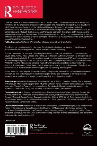 "This Handbook is a much-needed response to calls for more comprehensive historical and global reflections on the origins and emergence of translation and interpreting studies (TIS). It is structured into three main parts focusing on the intellectual history of thinking on translation, historical reconstruction of the development of translation and interpreting studies, and on the evolution of its central concepts. Through this historical and thematical approach, the volume both challenges and elaborates the origins of the dominant Western perspectives and adds to our understanding about the historical and cultural relativity of its key concepts. This book is a valuable resource for all students and researchers in the interdiscipline."