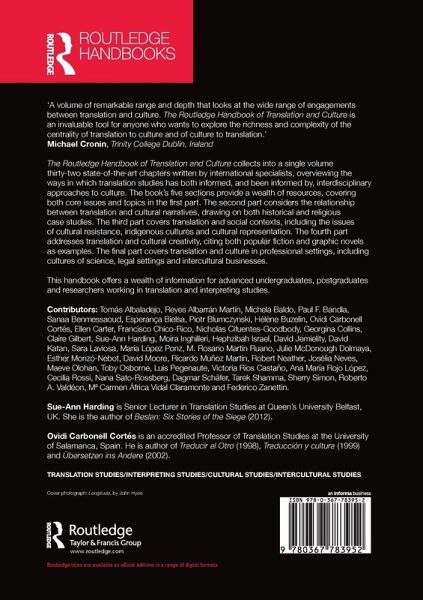 The Routledge Handbook of Translation and Culture collects into a single volume thirty-two state-of-the-art chapters written by international specialists, overviewing the ways in which translation studies has both informed, and been informed by, interdisciplinary approaches to culture. The book's five sections provide a wealth of resources, covering both core issues and topics in the first part. The second part considers the relationship between translation and cultural narratives, drawing on both historical and religious case studies. The third part covers translation and social contexts, including the issues of cultural resistance, indigenous cultures and cultural representation. The fourth part addresses translation and cultural creativity, citing both popular fiction and graphic novels as examples. The final part covers translation and culture in professional settings, including cultures of science, legal settings and intercultural businesses.