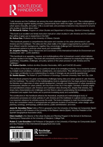 "This handbook is an appealing, massive, and multidisciplinary effort to broadcast current critical debates on urban studies in the region. The book will undoubtedly become a reference for analyzing the trajectories, specificities, inequalities, challenges, and policy options of the urban process in Latin America and the Caribbean."