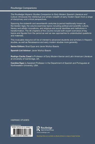 The Routledge Hispanic Studies Companion to Early Modern Spanish Literature and Culture introduces the intellectual and artistic breadth of early modern Spain from a range of disciplinary and critical perspectives. Spanning the sixteenth and seventeenth centuries (a period traditionally known as the Golden Age), the volume examines topics including political and scientific culture, literary and artistic innovations, and religious and social identities and institutions in transformation. The 36 chapters of the volume include both expert overviews of key topics and figures from the period as well as new approaches to understudied questions and materials. This invaluable resource will be of interest to advanced students and scholars in Hispanic studies, as well as Renaissance and early modern studies more generally.
