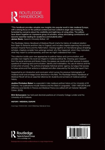 The Routledge History Handbook of Medieval Revolt charts the history of medieval rebellion from Spain to Bohemia and from Italy to England, and includes chapters spanning the centuries between Imperial Rome and the Reformation. Drawing together an international group of leading scholars, chapters consider how uprisings worked, why they happened, whom they implicated, what they meant to contemporaries, and how we might understand them now. This collection builds upon new approaches to political history and communication, and provides new insights into revolt as integral to medieval political life. Drawing upon research from the social sciences and literary theory, the essays use revolts and their sources to explore questions of meaning and communication, identity and mobilization, the use of violence and the construction of power. The authors emphasize historical actors' agency, but argue that access to these actors and their actions is mediated and often obscured by the texts that report them. Supported by an introduction and conclusion which survey the previous historiography of medieval revolt and envisage future directions in the field, The Routledge History Handbook of Medieval Revolt will be an essential reference for students and scholars of medieval political history.