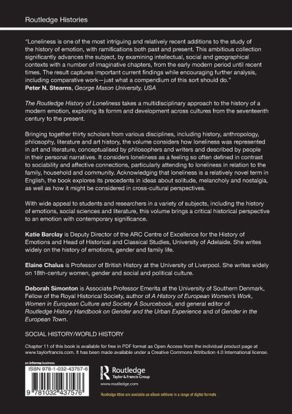 The Routledge History of Loneliness takes a multidisciplinary approach to the history of a modern emotion, exploring its form and development across cultures from the seventeenth century to the present.