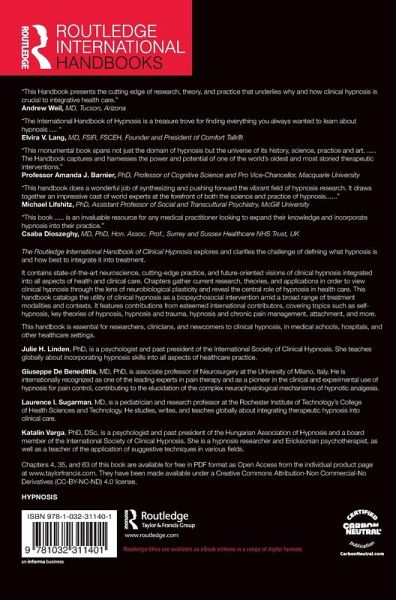 "The International Handbook of Clinical Hypnosis is a treasure trove for finding everything you always wanted to learn about hypnosis and, even more importantly, about what you didn't think of yet and would benefit from knowing in the rapidly changing, digitally-driven world. The international perspective and variety of the contributors' backgrounds avoid any one school of thought and provide a rich and diverse range of viewpoints for novices and practitioners of hypnosis alike. It is an instructive and greatly enjoyable read for anyone interested in hypnosis and promises to become the definitive reference on the topic."