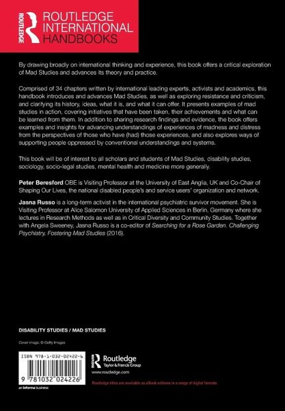 Comprised of 34 chapters written by international leading experts, activists and academics, this handbook introduces and advances Mad Studies, as well as exploring resistance and criticism, and clarifying its history, ideas, what it is, and what it can offer. It presents examples of mad studies in action, covering initiatives that have been taken, their achievements and what can be learned from them. In addition to sharing research findings and evidence, the book offers examples and insights for advancing understandings of experiences of madness and distress from the perspectives of those who have (had) those experiences, and also explores ways of supporting people oppressed by conventional understandings and systems.