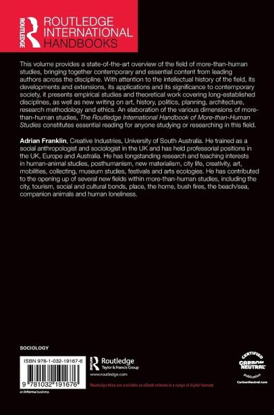 This volume provides a state-of-the-art overview of the field of more-than-human studies, bringing together contemporary and essential content from leading authors across the discipline. With attention to the intellectual history of the field, its developments and extensions, its applications and its significance to contemporary society, it presents empirical studies and theoretical work covering long-established disciplines, as well as new writing on art, history, politics, planning, architecture, research methodology and ethics. An elaboration of the various dimensions of more-than-human studies, The Routledge International Handbook of More-than-Human Studies constitutes essential reading for anyone studying or researching in this field.