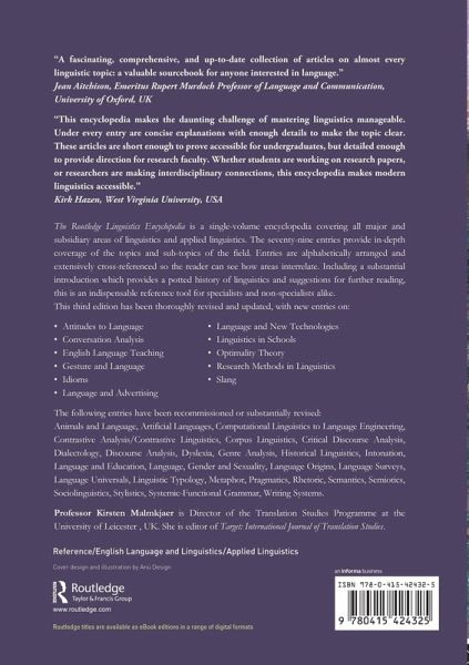 The Linguistics Encyclopedia is a single-volume Encyclopedia covering all major and subsidiary areas of linguistics and applied linguistics. The seventy nine articles provide in-depth coverage of the topics and sub-topics of the field, extensively cross-referenced so the reader can see how areas interrelate. Including a substantial introduction which provides a potted history of linguistics and suggestions for further reading, this is an indispensable reference tool for specialists and non-specialists alike. This new edition includes ten completely new articles, introducing new areas like slang language and new technologies. Articles from the previous edition have also been thoroughly updated.