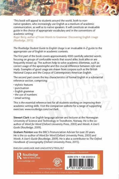 The Routledge Student Guide to English Usage is an invaluable A-Z guide to the appropriate use of English in academic contexts. The first part of the book covers approximately 4000 carefully selected words, focusing on groups of confusable words that sound alike, look alike or are frequently mixed up. The authors help to solve academic dilemmas, such as correct usage of the apostrophe and the crucial difference between infer and imply. Examples of good usage are drawn from corpora such as the British National Corpus and the Corpus of Contemporary American English. The second part covers the key characteristics of formal English in a substantial reference section, comprising: ¿ stylistic features ¿ punctuation ¿ English grammar ¿ the use of numbers ¿ email writing. This is the essential reference text for all students working on improving their academic writing skills. Visit the companion website for a range of supporting exercises: www.routledge.com/cw/clark.