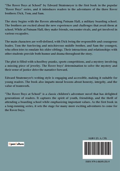 "The Rover Boys at School" by Edward Stratemeyer is the first book in the popular "Rover Boys" series, and it introduces readers to the adventures of the three Rover brothers: Dick, Tom, and Sam. The story begins with the Rovers attending Putnam Hall, a military boarding school. The brothers are excited about the new experiences and challenges that await them at school. While at Putnam Hall, they make friends, encounter rivals, and get involved in various escapades. The main characters are well-defined, with Dick being the responsible and courageous leader, Tom the fun-loving and mischievous middle brother, and Sam the youngest, who often tries to emulate his older siblings. Their interactions and relationships with other students provide both humor and drama throughout the story. The plot is filled with schoolboy pranks, sports competitions, and a mystery involving a missing piece of jewelry. The Rover boys' determination to solve the mystery and their sense of justice drive the narrative forward. Edward Stratemeyer's writing style is engaging and accessible, making it suitable for young readers. The book also imparts moral lessons about honesty, integrity, and the value of teamwork. "The Rover Boys at School" is a classic children's adventure novel that has delighted generations of readers. It captures the spirit of youth, friendship, and the thrill of attending a boarding school while emphasizing important values. As the first book in a long-running series, it sets the stage for many more exciting adventures to come for the Rover boys.
