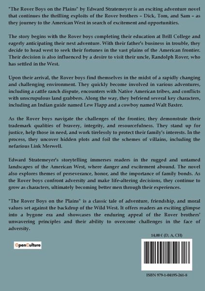 "The Rover Boys on the Plains" by Edward Stratemeyer is an exciting adventure novel that continues the thrilling exploits of the Rover brothers ¿ Dick, Tom, and Sam ¿ as they journey to the American West in search of excitement and opportunities. The story begins with the Rover boys completing their education at Brill College and eagerly anticipating their next adventure. With their father's business in trouble, they decide to head west to seek their fortunes in the vast plains of the American frontier. Their decision is also influenced by a desire to visit their uncle, Randolph Rover, who has settled in the West. Upon their arrival, the Rover boys find themselves in the midst of a rapidly changing and challenging environment. They quickly become involved in various adventures, including a cattle ranch dispute, encounters with Native American tribes, and conflicts with unscrupulous land grabbers. Along the way, they befriend several key characters, including an Indian guide named Lew Flapp and a cowboy named Walt Baxter. As the Rover boys navigate the challenges of the frontier, they demonstrate their trademark qualities of bravery, integrity, and resourcefulness. They stand up for justice, help those in need, and work tirelessly to protect their family's interests. In the process, they uncover hidden plots and foil the schemes of villains, including the nefarious Link Merwell. Edward Stratemeyer's storytelling immerses readers in the rugged and untamed landscapes of the American West, where danger and excitement abound. The novel also explores themes of perseverance, honor, and the importance of family bonds. As the Rover boys confront adversity and make life-altering decisions, they continue to grow as characters, ultimately becoming better men through their experiences. "The Rover Boys on the Plains" is a classic tale of adventure, friendship, and moral values set against the backdrop of the Wild West. It offers readers an exciting glimpse into a bygone era and showcases the enduring appeal of the Rover brothers' unwavering principles and their ability to overcome challenges in the face of adversity.