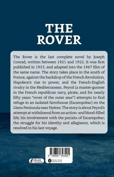 The Rover is the last complete novel by Joseph Conrad, written between 1921 and 1922. It was first published in 1923, and adapted into the 1967 film of the same name. The story takes place in the south of France, against the backdrop of the French Revolution, Napoleon's rise to power, and the French-English rivalry in the Mediterranean. Peyrol (a master-gunner in the French republican navy, pirate, and for nearly fifty years ""rover of the outer seas"") attempts to find refuge in an isolated farmhouse (Escampobar) on the Giens Peninsula near Hyères. The story is about Peyrol's attempt at withdrawal from an action- and blood-filled life; his involvement with the pariahs of Escampobar; the struggle for his identity and allegiance, which is resolved in his last voyage.