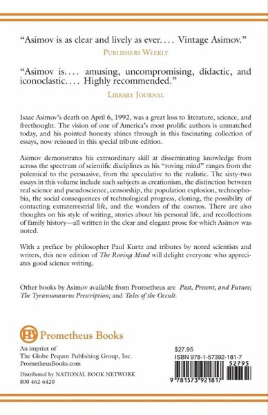 Isaac Asimov's death on April 6, 1992, was a great loss to the world of literary science and freethought. The prolific author's vision is unmatched today, and his pointed honesty shines through in The Roving Mind, now reissued in this special tribute edition.This collection of essays is wide-ranging, reflecting Asimov's extraordinary skill in disseminating knowledge from across the spectrum of human thought. Some of the areas explored in this volume of 62 essays include creationism, pseudoscience, censorship, population, philosophy of science, transportation, computers and corporations of the future, and astronomy. His predictions about cloning which has only recently become the topic of public debate the theory of "technophobia," and other scientific developments are astounding. In a lighter tone, Asimov includes several personal stories from his life including thoughts on his style of writing and memories of family in younger days.With tributes by Arthur C. Clarke, L. Sprague de Camp, Harlan Ellison, Kendrick Frazier, Martin Gardner, Donald Goldsmith, Stephen Jay Gould, E. C. Krupp, Frederik Pohl, and Carl Sagan