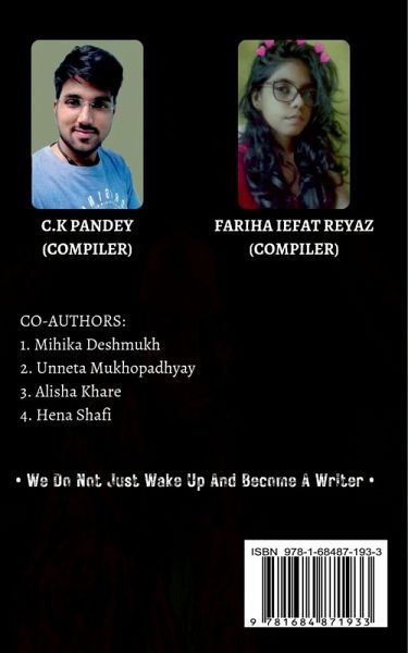 The Title of the book says it all, that this is a fictional- based anthology with unique contents. "The Royal Crown is a unique kind of anthology, as we can understand by reading the chapters. We put more emphasize on real life objects than fictional stuffs. Fariha Iefat Reyaz; C.K Pandey 15th September' 2021. This anthology consists of Fictional stories by, fourWriters,MihikaDeshmukh,Unneta Mukhopadhyay, Alisha Khare and Hena Shafi. Thanks to them for making the anthology a worth it collection by presenting with one of the best stories.