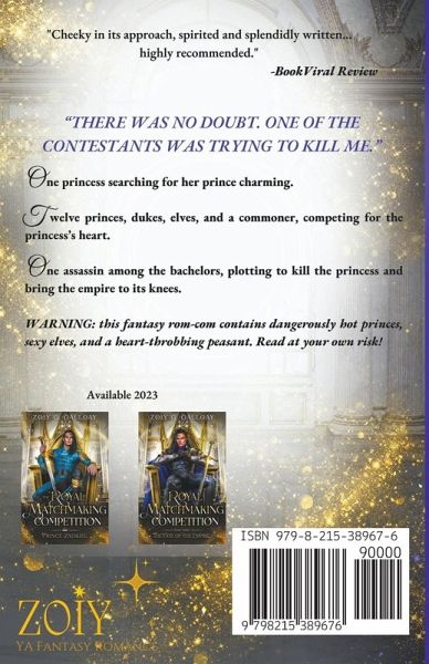 One princess searching for her prince charming. Twelve princes, elves, dukes, a dwarf, and a commoner, competing for the princess's hand in marriage. One assassin among the bachelors, plotting to kill the princess and bring the empire to its knees. Warning: this fantasy romance contains dangerously hot princes, sexy elves, and a heart-throbbing peasant. Read at your own risk! Princess Qloey is the heir to the Velazian Empire and of age to choose a husband. Twelve boys are invited to compete in a month long competition to win her heart and a seat on the throne. She thinks finding the right husband will be an easy and swift process, but after she meets the charming princes, beautiful elves, a dwarf, and a commoner, her heart gets swept off in different directions. More is at stake than a simple proposal or a broken heart. At the opening ceremony, an assassin tries to kill her and they soon discover that the mastermind is one of her twelve bachelors. Amidst several assassination attempts, centaur attacks, publicized group dates, and royal favoritism towards some competitors, choosing a husband becomes the hardest decision of her life, and threatens Qloey's very right to inherit the throne. Includes illustrated character art and special features. A brilliant and captivating debut slow-burn novel about love, coming-of-age, and discovery, and achieved with a dash of humor. -- This is a light fantasy and a clean romantic-comedy. No triggers or cussing.
