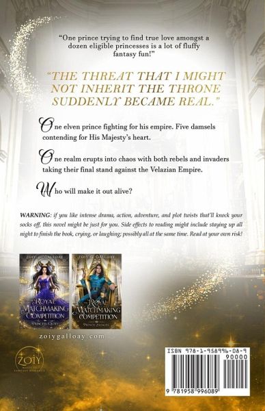 One elven prince fighting for his empire. Five damsels contending for His Majesty's heart. One realm erupts into chaos with both rebels and invaders taking their final stand against the Velazian Empire. Who will make it out alive? Warning: if you like intense drama, action, adventure, and plot twists that'll knock your socks off, this novel might be just for you. Side effects to reading might include staying up all night to finish the book, crying, or laughing; possibly all at the same time. Read at your own risk! -- Prince Zadkiel narrows his choices in marriage down to five girls, each of whom has won his heart. As rebels continue to attack the RMC contestants, spies run rampant in the palace, and tension with Baylor and Payonna reaches its peak, the Velazian royal family realizes that they have more enemies than they thought. Prince Zadkiel wonders if he will live to see the day he becomes crowned ruler of the Velazian Empire. -- Beware, a sense of humor required! Book one, two, and four can be read first in the series. The Fate of the Empire is the continuation of book two. Triggers: No gore. A clean romance with spice, appropriate for older teens, 15+. Genres: romantic comedy (rom-com), young adult, high fantasy, coming of age, slow burn romance, fae romance, elven, and royalty fiction, historical fiction, Renaissance.