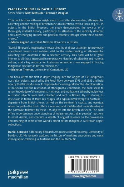 This book offers the first in-depth enquiry into the origins of 135 Indigenous Australian objects acquired by the Royal Navy between 1795 and 1855 and held now by the British Museum. In response to increasing calls for the 'decolonisation' of museums and the restitution of ethnographic collections, the book seeks to return knowledge of the moments, methods, and motivations whereby Indigenous Australian objects were first collected and sent to Britain. By structuring its discussion in terms of three key 'stages' of a typical naval voyage to Australia-departure from British shores, arrival on the continent's coasts, and eventual return to port-the book offers a nuanced and multifaceted understanding of the pathways followed by these 135 objects into the British Museum. The book offers important new understandings of Indigenous Australian peoples' reactions to naval visitors, and contains a wealth of original research on the provenance and meaning of some of the world's oldest extant Indigenous Australian object collections.