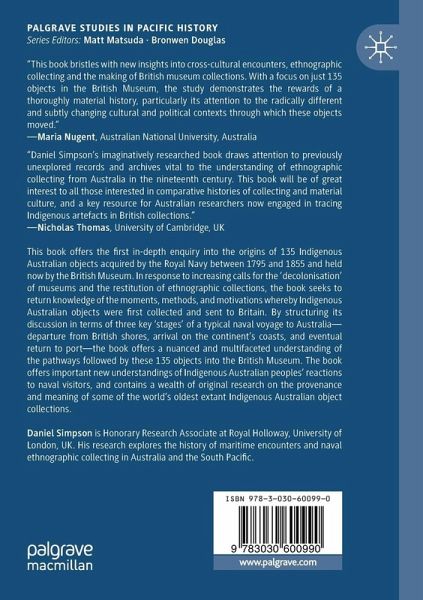 This book offers the first in-depth enquiry into the origins of 135 Indigenous Australian objects acquired by the Royal Navy between 1795 and 1855 and held now by the British Museum. In response to increasing calls for the 'decolonisation' of museums and the restitution of ethnographic collections, the book seeks to return knowledge of the moments, methods, and motivations whereby Indigenous Australian objects were first collected and sent to Britain. By structuring its discussion in terms of three key 'stages' of a typical naval voyage to Australia-departure from British shores, arrival on the continent's coasts, and eventual return to port-the book offers a nuanced and multifaceted understanding of the pathways followed by these 135 objects into the British Museum. The book offers important new understandings of Indigenous Australian peoples' reactions to naval visitors, and contains a wealth of original research on the provenance and meaning of some of the world's oldest extant Indigenous Australian object collections.