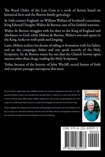 The Royal Order of the Last Coin is a work of fiction based on historical facts and the Burton family genealogy. In 14th century England, on William Wallace of Scotland's execution, King Edward I knights Walter de Burton, one of his faithful warriors. Walter de Burton struggles with his duty to the King of England and obedience to God, while Milton de Burton, Walter's son and squire to the King, looks on with pride and longing. Later, Milton realizes his dream of riding in formation with his father, and on the campaign, father and son speak secretly of the Holy Scriptures. Sir de Burton warns his son that the Church frowns upon anyone other than clergy reading the Holy Scriptures. Today, because of the bravery of John Wycliff, sacred hymns of faith and scripture passages intersperse this story.