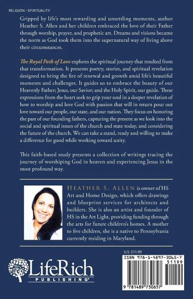 Gripped by life's most rewarding and unsettling moments, author Heather S. Allen and her children embraced the love of their Father through worship, prayer, and prophetic art. Dreams and visions became the norm as God took them into the supernatural way of living above their circumstances. The Royal Path of Love explores the spiritual journey that resulted from that transformation. It presents poetry, stories, and spiritual revelation designed to bring the fire of renewal and growth amid life's beautiful moments and challenges. It guides us to embrace the beauty of our Heavenly Father; Jesus, our Savior; and the Holy Spirit, our guide. These expressions from the heart seek to grip your soul in a deeper revelation of how to worship and love God with passion that will in return pour out love toward our people, our state, and our nation. They focus on honoring the past of our founding fathers, capturing the present as we look into the social and spiritual issues of the church and state today, and considering the future of the church. We can take a stand, ready and willing to make a difference for good while working toward unity. This faith-based study presents a collection of writings tracing the journey of worshiping God in heaven and experiencing Jesus in the most profound way.