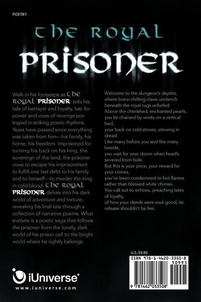 The Royal Prisoner tells a story of betrayal and loyalty, lust for power and vows of revenge portrayed in striking poetic rhythms. Years have passed since everything was taken from him-his family, his home, his freedom. Imprisoned for turning his back on his king, the sovereign of the land, the prisoner vows to escape his imprisonment to fulfill one last debt to his family and to himself-to murder the king in cold blood. The Royal Prisoner delves into his dark world of adventure and torture, revealing his final tale through a collection of narrative poems. What evolves is a poetic saga that follows the prisoner from the lonely, dark world of his prison cell to the bright world where he rightly belonged. Welcome to the dungeon's depths, where bone-chilling claws unclench beneath the royal rugs unfurled. Above the cherished, enchanted pearls, you lie chained by wrists on a vertical bed, your back on cold stones, stewing in dread. Like many before you and like many beside, you wait for your doom when head's severed from hide. But this is your price, your reward for your crimes, you've been condemned to hot flames rather than blessed white chimes. You call out to echoes, preaching tales of loyalty, of how your deeds were soul-good; its release shouldn't be fee.