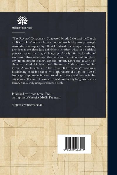 "The Roycroft Dictionary: Concocted by Ali Baba and the Bunch on Rainy Days" offers a humorous and insightful journey through vocabulary. Compiled by Elbert Hubbard, this unique dictionary provides more than just definitions; it offers witty and satirical perspectives on the English language. A delightful exploration of words and their meanings, this book will entertain and enlighten anyone interested in language and humor. Delve into a world of cleverly crafted definitions and discover a fresh take on familiar terms. A timeless classic, "The Roycroft Dictionary" remains a fascinating read for those who appreciate the lighter side of language. Explore the intersection of vocabulary and humor in this engaging collection. A wonderful addition to any language lover's library and a truly unique reference book. This work has been selected by scholars as being culturally important, and is part of the knowledge base of civilization as we know it. This work is in the public domain in the United States of America, and possibly other nations. Within the United States, you may freely copy and distribute this work, as no entity (individual or corporate) has a copyright on the body of the work. Scholars believe, and we concur, that this work is important enough to be preserved, reproduced, and made generally available to the public. We appreciate your support of the preservation process, and thank you for being an important part of keeping this knowledge alive and relevant.