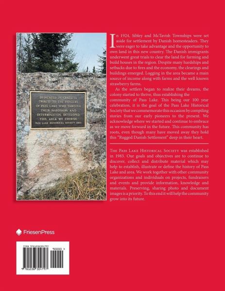 In 1924, Sibley and McTavish Townships were set aside for settlement by Danish homesteaders. They were eager to take advantage and the opportunity to own land in this new country. The Danish immigrants underwent great trials to clear the land for farming and build houses in the region. Despite many hardships and setbacks due to fires and the economy, the clearings and buildings emerged. Logging in the area became a main source of income along with farms and the well known strawberry farms. As the settlers began to realize their dreams, the colony started to thrive, thus establishing the community of Pass Lake. This being our 100 year celebration, it is the goal of the Pass Lake Historical Society that we commemorate this occasion by compiling stories from our early pioneers to the present. We acknowledge where we started and continue to embrace as we move forward in the future. This community has roots, even though many have moved away they hold this "Rugged Danish Settlement" deep in their heart.