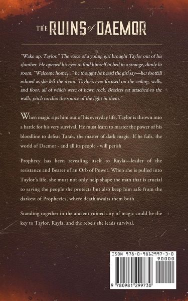 Ripped from his everyday life by magic, Taylor is thrown into a battle for his very survival. He must learn to use the latent magic of his bloodline to defeat Tarak, the master of dark magic. If he fails, the world of Daemor - and all its people - will perish. Prophecy has been revealing itself to Rayla-leader of the resistance and Bearer of an Orb of Power. When she is thrown into Taylor's life, she must not only help shape the man that is key to saving the people she protects but also keep him safe from the darkest of Prophecies, where death awaits them both.