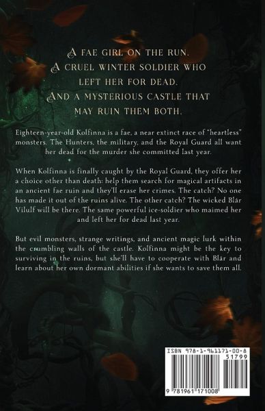 A fae girl on the run. A cruel winter soldier who left her for dead. And a mysterious castle that may ruin them both. Eighteen-year-old Kolfinna is a fae, a near extinct race of "heartless" monsters. The Hunters, the military, and the Royal Guard all want her dead for the murder she committed last year. When Kolfinna is finally caught by the Royal Guard, they offer her a choice other than death: help them search for magical artifacts in an ancient fae ruin and they'll erase her crimes. The catch? No one has made it out of the ruins alive. The other catch? The wicked Blár Vilulf will be there. The same powerful ice-soldier who maimed her and left her for dead last year. But evil monsters, strange writings, and ancient magic lurk within the crumbling walls of the castle. Kolfinna might be the key to surviving in the ruins, but she'll have to cooperate with Blár and learn about her own dormant abilities if she wants to save them all.