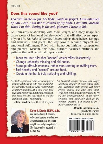 Karen R. Koenig Contributor residences (Roxbury, MA): Psychotherapist and educator, former chronic dieter and world-class binger, Karen Koenig, LicSW, M.Ed. transformed herself from overweight and unhappy to fulfilled and weight-comfortable by learning to become a "normal" eater. She is a clinical social worker in private practice with more than 20 years' experience helping hundreds of compulsive, emotional, and restrictive eaters learn to eat normally. A skilled and dynamic teacher, Ms. Koenig runs graduate social work and psychology continuing education programs in eating and weight management, where she teaches her "normal eating" model. She is a founding member of the Greater Boston Committee of the Massachusetts Eating Disorders Association, and is an active member of the National Association of Social Workers, Massachusetts Chapter Private Practice Committee. As a frequent contributor to Focus, NASW's state publication, Ms. Koenig has written columns on eating, weight, and body image problems. Her personal essays have been published in The Boston Globe, The Boston Herald, and other local and national publications. She was a semifinalist in the 1999 Massachusetts Film Office Screenwriting Contest and received a Certificate of Achievement in the 1996 Writer's Digest Literary Short Story Contest. Over the past three decades, she has been interviewed on radio, television, and in print and served as spokeswoman for groups such as 9 to 5, Organization of Women Office Workers, the FACE Program, and the Self-Esteem Boston Educational Institute.