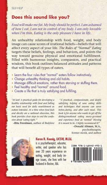 Written in easy-to-understand, everyday language, The Rules of "Normal" Eating lays out the four basic rules that "normal" eaters follow instinctively - eating when they're hungry, choosing foods that satisfy them, eating with awareness and enjoyment, and stopping when they're full or satisfied. Along with specific skills and techniques that help promote change, the book presents a proven cognitive-behavioral model of transformation that targets beliefs, feelings, and behaviors about food and eating and points the way toward genuine physical and emotional fulfillment. Readers learn how to reprogram their dysfunctional beliefs, manage uncomfortable feelings without turning to food, and establish new eating habits that tune their bodies into natural sensations of hunger, pleasure, satisfaction, and satiation. Filled with humorous insights, compassion, and practical wisdom, the book outlines balanced attitudes and patterns that benefit all types of eaters.