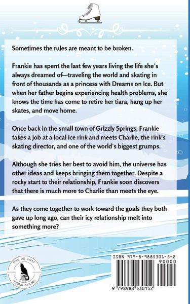 Some rules are meant to be broken. Frankie has spent the last few years living the life she's always dreamed of-traveling the world and skating in front of thousands as a professional figure skater. But when her father begins experiencing health problems, she knows she must make the difficult decision to retire and move home. Once back in Grizzly Springs, Frankie takes a job at a local ice rink, where she meets Charlie, a former national champion in pairs, and the rink's skating director. Despite their relationship getting off to a rocky start, Frankie soon discovers that there is much more to Charlie than meets the eye. As they come together to work toward the goals they both gave up long ago, will their icy relationship melt into something more? This is a sweet romance about love and second chances. No cursing, kissing only.