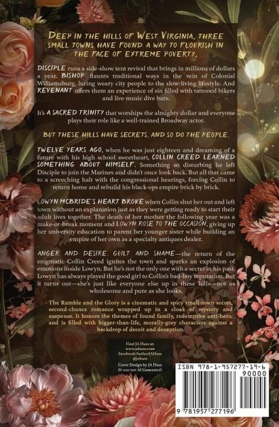 Deep in the hills of West Virginia, three small towns have found a way to flourish in the face of extreme poverty. Disciple runs a side-show tent revival that brings in millions of dollars a year. Bishop flaunts traditional ways in the vein of Colonial Williamsburg, luring weary city people to the slow-living lifestyle. And Revenant offers them an experience of sin filled with tattooed bikers and live-music dive bars. It's a sacred trinity that worships the almighty dollar and everyone plays their role like a well-trained Broadway actor. But these hills have secrets, and so do the people. Twelve years ago, when he was just eighteen and dreaming of a future with his high school sweetheart, Collin Creed learned something about himself. Something so disturbing he left Disciple to join the Marines and didn't once look back. But all that came to a screeching halt with the congressional hearings, forcing Collin to return home and rebuild his black-ops empire brick by brick. Lowyn McBride's heart broke when Collin shut her out and left town without an explanation just as they were getting ready to start their adult lives together. The death of her mother the following year was a make-or-break moment and Lowyn rose to the occasion, giving up her university education to parent her younger sister while building an empire of her own as a specialty antiques dealer. Anger and desire, guilt and shame-the return of the enigmatic Collin Creed ignites the town and sparks an explosion of emotions inside Lowyn. But he's not the only one with a secret in his past. Lowyn has always played the good girl to Collin's bad-boy reputation. But it turns out-she's just like everyone else up in these hills-not as wholesome and pure as she looks. The Rumble and the Glory is a cinematic and spicy small-town secret, second-chance romance wrapped up in a cloak of mystery and suspense. It honors the themes of found family, redemptive anti-hero, and is filled with bigger-than-life, morally-grey characters against a backdrop of deceit and deception. TROPES: Touch her and Die Small Town - Big Secrets Opposites Attract Second Chance Childhood Sweethearts Morally Grey Found Family Alpha Hero