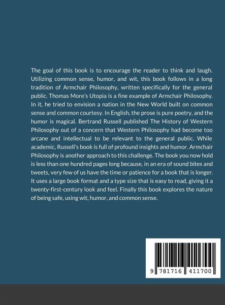 The goal of this book is to encourage the reader to think and laugh. Utilizing common sense, humor, and wit, this book follows in a long tradition of Armchair Philosophy, written specifically for the general public. Thomas More's Utopia is a fine example of Armchair Philosophy. In it, he tried to envision a nation in the New World built on common sense and common courtesy. In English, the prose is pure poetry, and the humor is magical. Bertrand Russell published The History of Western Philosophy out of a concern that Western Philosophy had become too arcane and intellectual to be relevant to the general public. While academic, Russell's book is full of profound insights and humor. Armchair Philosophy is another approach to this challenge. This book is less than one hundred pages long because, in an era of sound bites and tweets, very few of us have the time or patience for a book that is longer. It uses a large book format and a type size that is easy to read, giving it a twenty-first-century look and feel. Finally this book explores the nature of being safe, using wit, humor, and common sense.