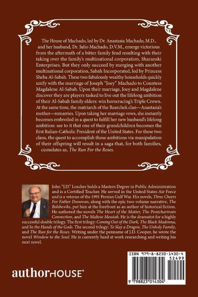 The House of Machado, led by Dr. Anastasia Machado, M.D., and her husband, Dr. Julio Machado, D.V.M., emerge victorious from the aftermath of a bitter family feud resulting with their taking over the family's multinational corporation, Sharanski Enterprises. But they only succeed by merging with another multinational corporation, Sabah Incorporated, led by Princess Sheba Al-Sabah. These two fabulously wealthy households quickly unify with the marriage of Joseph "Joey" Machado to Countess Magdalene Al-Sabah. Upon their marriage, Joey and Magdalene discover they are players tasked to live out the lifelong ambition of their Al-Sabah family elders: win horseracing's Triple Crown. At the same time, the matriarch of the Rearchek clan-Anastasia's mother-remarries. Upon taking her marriage vows, she instantly becomes embroiled in a quest to fulfill her new husband's lifelong ambition: see to it that one of their grandchildren becomes the first Italian-Catholic President of the United States. For these two clans, the quest to accomplish those ambitions via manipulation of their offspring will result in a saga that, for both families, cumulates as, The Run For the Roses.