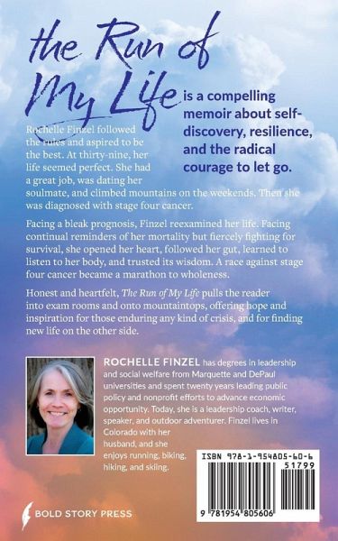 The Run of My Life is a compelling memoir about self-discovery, resilience, and the radical courage to let go. Rochelle Finzel followed the rules and aspired to be the best. At thirty-nine, her life seemed perfect. She had a great job, was dating her soulmate, climbed mountains on the weekends and had just run a personal best marathon. Four days later, she was diagnosed with stage IV cancer. Facing a bleak prognosis, Rochelle reexamined her life. Facing continual reminders of her mortality but fiercely fighting for survival, she opened her heart, followed her gut, learned to listen to her body, and trusted its wisdom. A race against stage four cancer became a marathon to wholeness. Honest and heartfelt, The Run of My Life pulls the reader into exam rooms and onto mountaintops, offering hope and inspiration for those enduring any kind of crisis, and for finding new life on the other side.