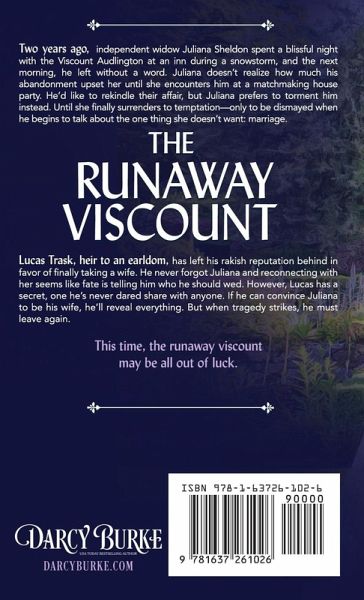 Two years ago, independent widow Juliana Sheldon spent a blissful night with the Viscount Audlington at an inn during a snowstorm, and the next morning, he left without a word. Juliana doesn't realize how much his abandonment upset her until she encounters him at a matchmaking house party. He'd like to rekindle their affair, but Juliana prefers to torment him instead. Until she finally surrenders to temptation-only to be dismayed when he begins to talk about the one thing she doesn't want: marriage. Lucas Trask, heir to an earldom, has left his rakish reputation behind in favor of finally taking a wife. He never forgot Juliana and reconnecting with her seems like fate is telling him who he should wed. However, Lucas has a secret, one he's never dared share with anyone. If he can convince Juliana to be his wife, he'll reveal everything. But when tragedy strikes, he must leave again. This time, the runaway viscount may be all out of luck.