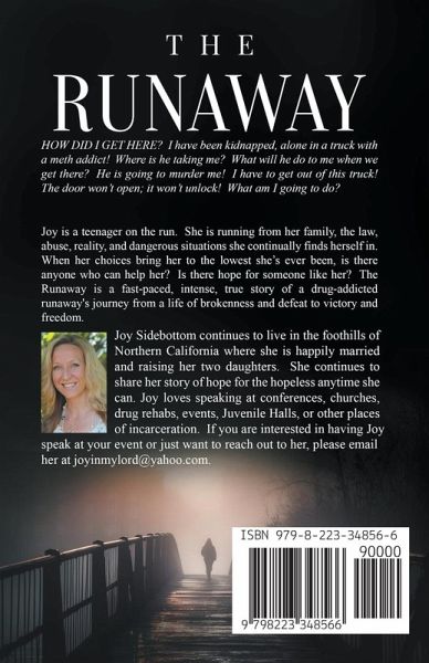 HOW DID I GET HERE? I have been kidnapped, alone in a truck with a meth addict! Where is he taking me? What will he do to me when we get there? He is going to murder me! I have to get out of this truck! The door won't open; it won't unlock! What am I going to do? The Runaway is a fast-paced, intense true story of a drug-addicted runaway's journey from brokenness and defeat to new life and victory. Joy is a runaway teen, running from her family, the law, abuse, reality, and dangerous situations she continually finds herself in. When her choices bring her to the lowest she's ever been, is there anyone who can help her? Is there hope for someone like her?