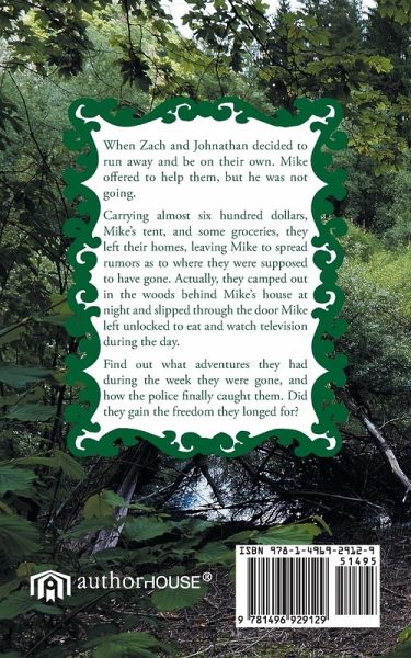 When Zach and Johnathan decided to run away and be on their own. Mike offered to help them, but he was not going. Carrying almost six hundred dollars, Mike?s tent, and some groceries, they left their homes, leaving Mike to spread rumors as to where they were supposed to have gone. Actually, they camped out in the woods behind Mike?s house at night and slipped through the door Mike left unlocked to eat and watch television during the day. Find out what adventures they had during the week they were gone, and how the police finally caught them. Did they gain the freedom they longed for?