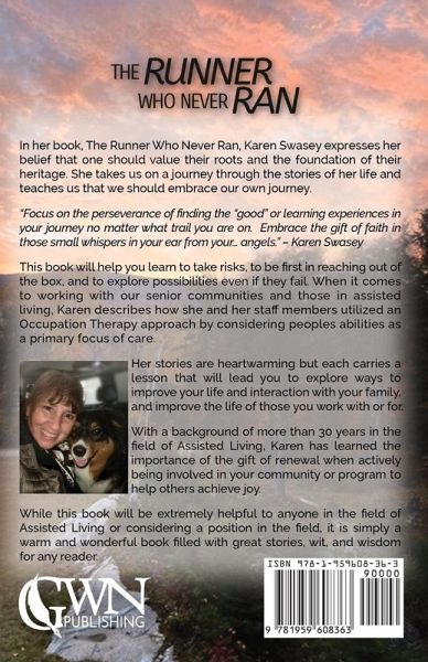 ¿In her book, The Runner Who Never Ran, Karen Swasey expresses her belief that one should value their roots and the foundation of their heritage. She takes us on a journey through the stories of her life and teaches us that we should embrace our own journey. "Focus on the perseverance of finding the "good" or learning experiences in your journey no matter what trail you are on. Embrace the gift of faith in those small whispers in your ear from your... angels." - Karen Swasey This book will help you learn to take risks, to be first in reaching out of the box, and to explore possibilities even if they fail. When it comes to working with our senior communities and those in assisted living, Karen describes how she and her staff members utilized an Occupation Therapy approach by considering peoples abilities as a primary focus of care. Her stories are heartwarming but each carries a lesson that will lead you to explore ways to improve your life and interaction with your family, and improve the life of those you work with or for. With a background of more than 30 years in the field of Assisted Living, Karen has learned the importance of the gift of renewal when actively being involved in your community or program to help others achieve joy. While this book will be extremely helpful to anyone in the field of Assisted Living or considering a position in the field, it is simply a warm and wonderful book filled with great stories, wit, and wisdom for any reader.