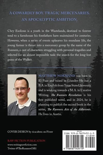 Chry Esolious is a youth in the Wastelands, destined to forever tend to a farmhouse his forefathers have maintained for centuries. However, when a series of events upheaves his mundane life, the young farmer is thrust into a mercenary group by the name of the Runners, a cast of characters struggling with personal tragedies and selected for an almost impossible task: the search for the long-lost gems of the Walker. The Runners Revelation is the beginning of a journey that explores the complexities and themes of courage, grief, and found family.
