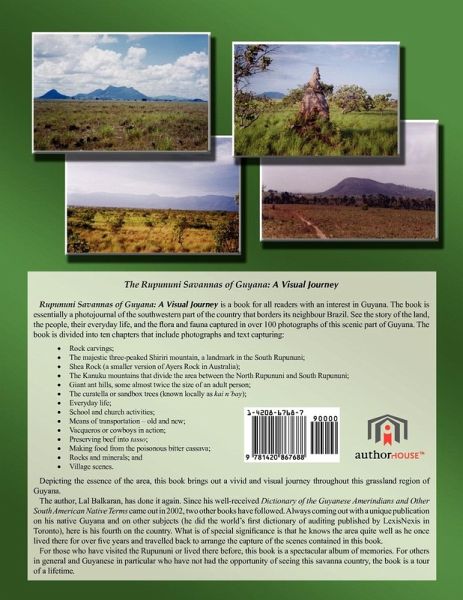 Rupununi Savannas of Guyana: A Visual Journey is a book for all readers with an interest in Guyana. The book is essentially a photojournal of the southwestern part of the country that borders its neighbour Brazil. See the story of the land, the people, their everyday life, and the flora and fauna captured in over 100 photographs of this scenic part of Guyana. The book is divided into ten chapters that include photographs and text capturing: · Rock carvings; · The majestic three-peaked Shiriri mountain, a landmark in the South Rupununi; · Shea Rock (a smaller version of Ayers Rock in Australia); · The Kanuku mountains that divide the area between the North Rupununi and South Rupununi; · Giant ant hills, some almost twice the size of an adult person; · The curatella or sandbox trees (known locally as kai n'bay); · Everyday life; · School and church activities; · Means of transportation - old and new; · Vacqueros or cowboys in action; · Preserving beef into tasso; · Making food from the poisonous bitter cassava; · Rocks and minerals; and · Village scenes. Depicting the essence of the area, this book brings out a vivid and visual journey throughout this grassland region of Guyana. The author, Lal Balkaran, has done it again. Since his well-received Dictionary of the Guyanese Amerindians and Other South American Native Terms came out in 2002, two other books have followed. Always coming out with a unique publication on his native Guyana and on other subjects (he did the world's first dictionary of auditing published by LexisNexis in Toronto), here is his fourth on the country. What is of special significance is that he knows the area quite well as he once lived there for over five years and travelled back to arrange the capture of the scenes contained in this book. For those who have visited the Rupununi or lived there before, this book is a spectacular album of memories. For others in general and Guyanese in particular who have not had the opportunity of seeing this savanna country, the book is a tour of a lifetime.
