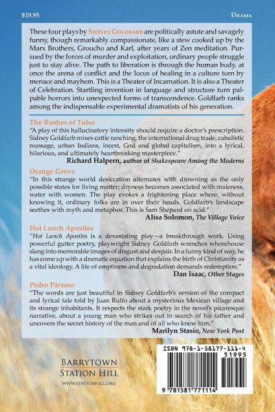 These four plays by Sidney Goldfarb are politically astute and savagely funny, though remarkably compassionate, like a stew cooked up by the Marx Brothers, Groucho and Karl, after years of Zen Meditation. Pursued by the forces of murder and exploitation, ordinary people struggle just to stay alive. The path to liberation is through the human body, at once the arena of conflict and the locus of healing in a culture torn by menace and mayhem. This is a Theater of Incarnation. It is also a Theater of Celebration. Startling invention in language and structure turn palpable horrors into unexpected forms of transcendence. To the discerning ear these plays are actually poetry disguised as theater. Goldfarb ranks among the indispensable experimental poet/playwrights of his generation. Praise for the plays: "A play ["The Rushes of Tulsa"] of this hallucinatory intensity should require a doctor's prescription. Sidney Goldfarb mixes cattle ranching, the international drug trade, cabalistic massage, urban Indians, incest, God and global capitalism, into a lyrical, hilarious, and ultimately heartbreaking masterpiece." - Richard Halpern, author of Norman Rockwell: The Underside of Innocence and Shakespeare Among the Moderns "In this strange world desiccation alternates with drowning as the only possible states for living matter; dryness becomes associated with maleness, water with women. The play ["Orange Grove"] evokes a frightening place where, without knowing it, ordinary folks are in over their heads. Goldfarb's landscape seethes with myth and metaphor. This is Sam Shepard on acid." - Alisa Solomon, The Village Voice "'Hot Lunch Apostles' is a devastating play - a breakthrough work. Using powerful gutter poetry, playwright Sidney Goldfarb wrenches whorehouse slang into memorable images of disgust and despair. In a funny kind of way, he has come up with a dramatic equation that explains the birth of Christianity as a vital ideology. A life of emptiness and degradation demands redemption." -Dan Isaac, Other Stages "The words are just beautiful in Sidney Goldfarb's version of the compact and lyrical tale