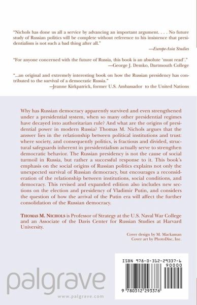 Why has Russian democracy apparently survived and even strengthened under a presidential system, when so many other presidential regimes have decayed into authoritarian rule? And what are the origins of presidential power in modern Russia? Thomas M. Nichols argues that the answer lies in the relationship between political institutions and trust: where society, and consequently politics, is fractious and divided, structural safeguards inherent in presidentialism actually serve to strengthen democratic behavior. The Russian presidency is not the cause of social turmoil in Russia, but rather a successful response to it. This book's emphasis on the social origins of Russian politics explains not only the unexpected survival of Russian democracy, but encourages a reconsideration of the relationship between institutions, social conditions, and democracy.
