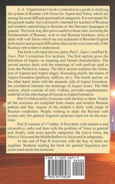 A. A. Vilgelminina's book is intended as a guide in studying the system of Russian verb forms for Aspect and Voice, which are among the most difficult grammatical categories. It is not meant for the general reader, but is primarily intended for teachers of Russian and students specialising in Russian or the Slavonic languages in general. The book may also prove useful to those who, knowing the fundamentals of Russian, wish to read Russian literature, since it deals with verb forms which are not explained in Russian-English dictionaries and present difficulties that can be overcome only if the Russian verb system is understood. The book is divided into two parts, Part I , Aspect, and Part II, Voice. Part I comprises five sections. The first section gives the definition of Aspect, its meaning and formal characteristics. The second section deals with the meanings of verb prefixes used to form the Perfective Aspect. The third section explains the formation of Aspects and Aspect stages, discussing mainly the means of Aspect formation (prefixes, suffixes, etc.). The fourth section, on the other hand, deals with the semantic side of Aspect formation: the correlation between the meanings of Aspect forms. The fifth section, which consists of only 4 tables, provides supplementary material on the interchange of sounds in Aspect formation. Part I is followed by Exercises with the Key to them. Nearly all the exercises are compiled from classic and modern Russian authors and they require of the student a fairly wide range of Russian vocabulary. People wishing to study the Russian verb system only for general linguistic purposes need not do the exercises. Part II consists of 17 tables. It first deals with transitive and intransitive verbs and then with the problem of Voice in general and, finally, with more specific categories: the Active Voice, the Passive Voice and the Middle Reflexive Voice and its subgroups. At the end of Part II Exercises with the Key to them are supplied. Students reading the book for general linguistics purposes need not do the exercises.
