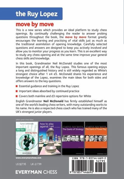 This is a new series which provides an ideal platform to study chess openings. By continually challenging the reader to answer probing questions throughout the book, the Move by Move format greatly encourages the learning and practising of vital skills just as much as the traditional assimilation of opening knowledge. Carefully selected questions and answers are designed to keep you actively involved and allow you to monitor your progress as you learn. This is an excellent way to study any chess opening and at the same time improve your general chess skills and knowledge. In this book, Grandmaster Neil McDonald studies one of the most important openings of all, the Ruy Lopez. This famous opening enjoys a long and distinguished history and is still widely regarded as White's strongest choice after 1 e4 e5. McDonald shares his experience and knowledge of the Lopez, examines the main ideas for both sides and offers answers to the key questions. *Essential guidance and training in the Ruy Lopez*Important ideas absorbed by continued practice*Covers both mainline and d3 repertoire options for White