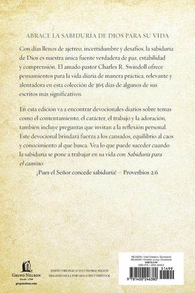 Reciba aliento cada d¿¿a a medida que crece en sabidur¿¿a. El amado pastor Charles R. Swindoll ofrece pensamientos para la vida diaria de manera pr¿¿ctica, relevante y alentadora en esta colecci¿¿n de 365 d¿¿as de algunos de sus escritos m¿¿s significativos. Con 365 d¿¿as de meditaciones del libro de Proverbios, Swindoll comparte sabias palabras para gente ocupada sobre temas como la satisfacci¿¿n, el car¿¿cter, el trabajo y la adoraci¿¿n. Tanto hombres como mujeres disfrutar¿¿n: Devociones breves y significativas que ofrecen consejos b¿¿blicos relevantes en tan solo unos minutos al d¿¿a. Sabias palabras exträ¿das del libro de Proverbios que le ayudar¿¿n cuando se sienta ocupado y abrumado. Inspiraci¿¿n para ayudarle a crecer en su fe Preguntas que invitan a la reflexi¿¿n personal Sabidur¿¿a para el camino brindar¿¿ fuerza a los cansados, equilibrio al caos y conocimiento al que busca. Vea lo que puede suceder cuando la sabidur¿¿a se pone a trabajar en su vida con Sabidur¿¿a para el camino. Wisdom for the Way Be encouraged every day as you grow in wisdom. Beloved pastor Charles R. Swindoll offers thoughts for daily living in a practical, relevant and encouraging way in this 365-day collection of some of his most significant writings. With 365 days of meditations from the book of Proverbs, Swindoll shares wise words for busy people on topics such as contentment, character, work, and worship. Both men and women will enjoy: Brief, meaningful devotions that give relevant, biblical advice in just a few minutes a day Wise words gleaned from the book of Proverbs to help when you are feeling busy and overwhelmed Inspiration to help you grow in your faith Questions that invite personal reflection Wisdom for the Way will bring strength to the weary, balance to the chaotic, and knowledge to the seeker. See what can happen when wisdom is put to work in your life with Wisdom for the Journey.