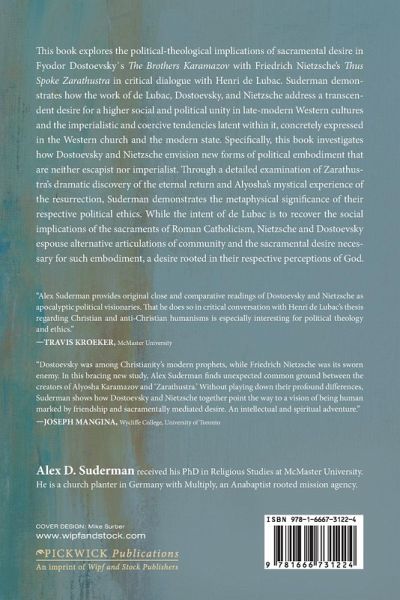 This book explores the political-theological implications of sacramental desire in Fyodor Dostoevsky`s The Brothers Karamazov with Friedrich Nietzsche's Thus Spoke Zarathustra in critical dialogue with Henri de Lubac. Suderman demonstrates how the work of de Lubac, Dostoevsky, and Nietzsche address a transcendent desire for a higher social and political unity in late-modern Western cultures and the imperialistic and coercive tendencies latent within it, concretely expressed in the Western church and the modern state. Specifically, this book investigates how Dostoevsky and Nietzsche envision new forms of political embodiment that are neither escapist nor imperialist. Through a detailed examination of Zarathustra's dramatic discovery of the eternal return and Alyosha's mystical experience of the resurrection, Suderman demonstrates the metaphysical significance of their respective political ethics. While the intent of de Lubac is to recover the social implications of the sacraments of Roman Catholicism, Nietzsche and Dostoevsky espouse alternative articulations of community and the sacramental desire necessary for such embodiment, a desire rooted in their respective perceptions of God.