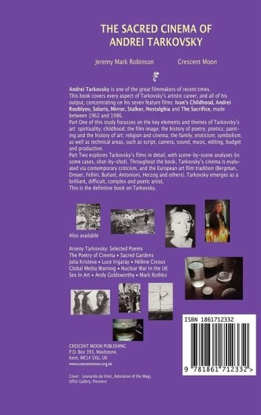 THE SACRED CINEMA OF ANDREI TARKOVSKYBy Jeremy RobinsonA major new study of Russian filmmaker Andrei Tarkovsky (1932-1986), director of seven feature films, including Mirror, Andrei Rublev, Solaris and The Sacrifice. This book explores every aspect of Andrei Tarkovsky's output in the most detailed fashion - including scripts, budget, production, shooting, editing, camera, sound, music, acting, themes, symbols, motifs, and spirituality. Tarkovsky's films are analyzed in depth, with scene-by-scene discussions. This is an important addition to film studies, the most painstaking study of Andrei Tarkovsky's work available. Andrei Tarkovsky is one of the most fascinating of filmmakers. He is supremely romantic, an old-fashioned, traditional artist - at home in the company Leonardo da Vinci, Pieter Brueghel, Aleksandr Pushkin, Fyodor Dostoievsky and Byzantine icon painters. Tarkovsky is a magician, no question, but argues for demystification (even while films celebrate mystery). His films are full of magical events, dreams, memory sequences, multiple viewpoints, multiple time zones and bizarre occurrences. As genre films, Andrei Tarkovsky's movies are some of the most accomplished in cinema. As science fiction films, Stalker and Solaris have no superiors, and very few peers. Only the greatest sci-fi films can match them: Metropolis, King Kong, Close Encounters of the Third Kind and 2001: A Space Odyssey. Tarkovsky happily and methodically rewrote the rules of the sci-fi genre: Stalker and Solaris are definitely not routine genre outings. They don't have the monsters, the aliens, the visual effects, the battles, the laser guns, the stunts and action set-pieces of regular science fiction movies. No one could deny that Andrei Rublev is one of the greatest historical films to explore the Middle Ages, up there with The Seventh Seal, El Cid, The Navigator and Pier Paolo Pasolini's 'Life' trilogy. If you judge Andrei Rublev in terms of historical accuracy, epic spectacle, serious themes, or cinematic poetry, it comes out at the top. Finally, in the religious film genre, The Sacrifice and Nostalghia are among the finest in cinema, the equals of the best of Ingmar Bergman, Luis Bunuel, Robert Bresson and Carl-Theodor Dreyer. Contains 150 illustrations, of Andrei Tarkovsky's films, Tarkovsky at work, his contemporaries, and his favourite painters. This edition has 23 new pages of illustrations. Bibliography, filmographies and notes. Illustrated. 696pp. www.crmoon.comREVIEW: Robinson's book on the sacred cinema of Tarkovsky is one of the best on the subject. Professor Prakash Kona, English and Foreign Languages University