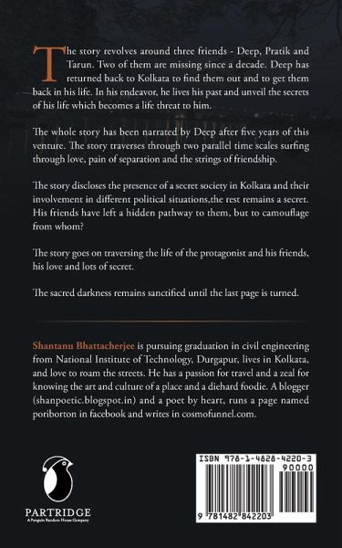 The story revolves around three friends - Deep, Pratik and Tarun. Two of them are missing since a decade. Deep has returned back to Kolkata to find them out and to get them back in his life. In his endeavor, he lives his past and unveil the secrets of his life which becomes a life threat to him. The whole story has been narrated by Deep after five years of this venture. The story traverses through two parallel time scales surfing through love, pain of separation and the strings of friendship. The story discloses the presence of a secret society in Kolkata and their involvement in different political situations,the rest remains a secret. His friends have left a hidden pathway to them, but to camouflage from whom? The story goes on traversing the life of the protagonist and his friends, his love and lots of secret. The sacred darkness remains sanctified until the last page is turned.